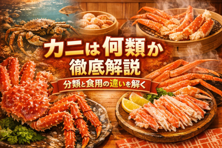 根拠の要点:カニはエビ目(十脚類)に属し、尾の形態などから「カニ亜目(短尾類:いわゆる本来のカニ)」と「ヤドカリ亜目(異尾類:ヤドカリの仲間)」に大別されます(出典:Wikipedia「カニ」 – https://ja.wikipedia.org/wiki/%E3%82%AB%E3%83%8B)。日本の食卓で人気の四大カニは、タラバガニ・ズワイガニ・毛ガニ・花咲ガニとされます(出典:三陸直送館 – https://sanchoku-mall.com/blogs/column/kani_syurui_ichirann)。