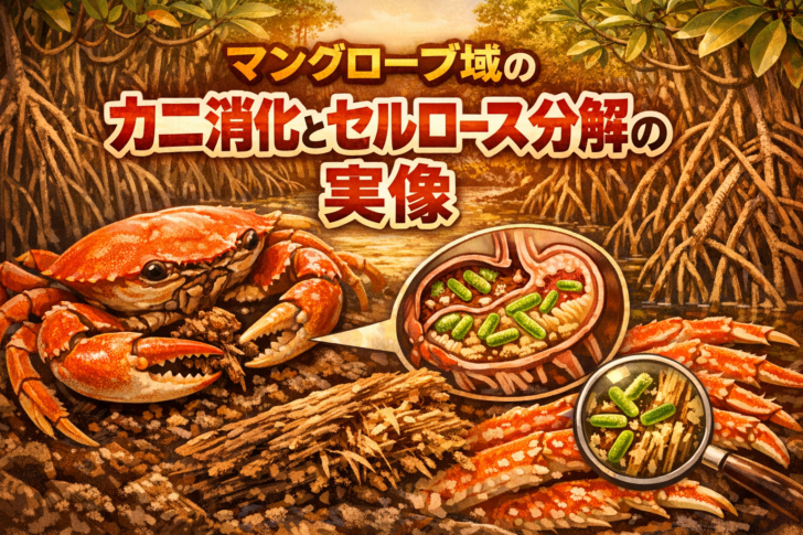 「カニは植物由来の繊維質をどこまで消化できるのか」「セルロースやリグニンのような難分解成分を利用できるのか」という疑問は、カニの消化の仕組みや食性の理解だけでなく、マングローブ生態系での役割や資源循環、さらには産業応用の可能性を考えるうえでも重要です。