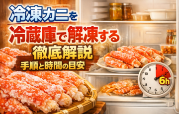 ボイル冷凍は冷蔵庫で12〜24時間の「低温長時間解凍」が基本とされ、名店の解説でも推奨されています(松葉総本店のガイドより)。一方、生の冷凍カニは密封袋に入れて水道水を細く流す「流水解凍」で30分〜1時間が目安とされ、短時間で均一化しやすいのが利点です(ふるなびの解説より)。