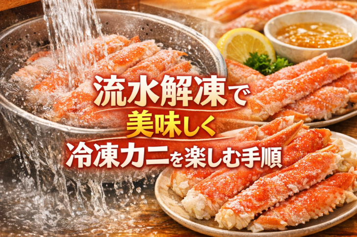 結論として、カニの解凍は「袋で密封」+「弱めの流水」+「半解凍で止める」の三点が要で、20〜60分の範囲を目安に触感で見極めるのがもっとも失敗が少ないと言えるでしょう。