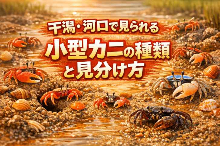 潮が引いた干潟や河口で小さなカニを見つけ、「種類や名前が知りたい」「簡単に見分ける方法が知りたい」という方を想定しています。家族の自然観察や自由研究、写真記録にも役立つ内容です。