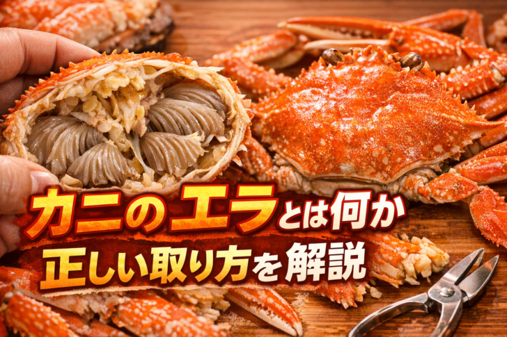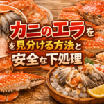カニのエラは、甲羅内の脚付け根に沿って並ぶ灰色のヒラヒラで、風味・食感・衛生面の観点から食べないのが基本です。甲羅を外したら最初に左右のエラを根元から外し、短時間の洗いで細片を除去してから切り分けると、取り残しや風味低下を防げます。種類によって見た目に差はありますが、判断基準と除去の手順は共通なので、落ち着いて丁寧に進めるのがおすすめです。