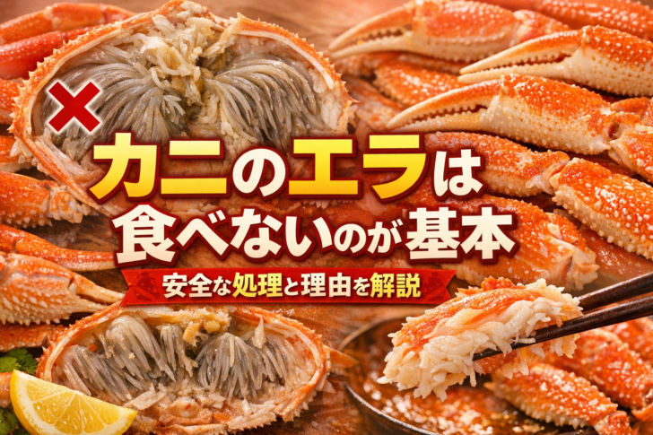 - エラ以外にも胃袋・口は食べない部位で、衛生管理と十分加熱・適切保存で食中毒リスクを下げましょう(ふるなび、やましょう かにや、厚生労働省)。