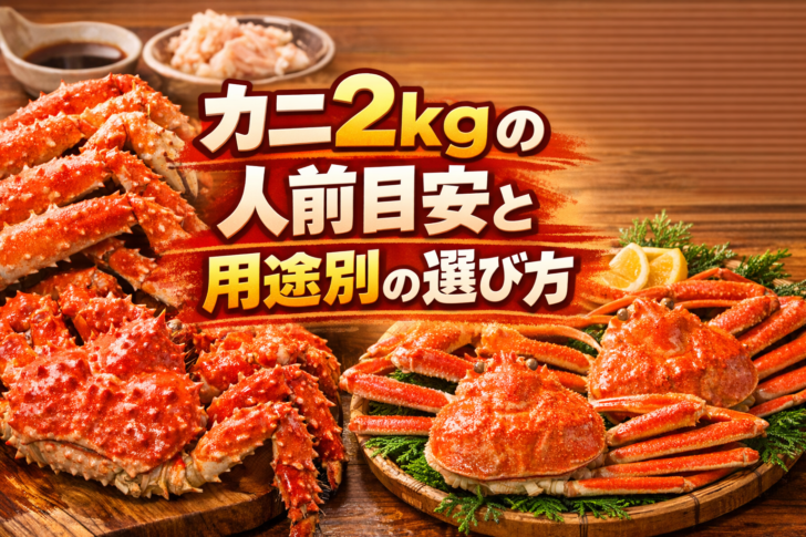 参考情報:ますよね(特大タラバ蟹 足1.8kg/総重量2kg)では4〜5人目安、匠本舗(生ずわい蟹むき身2kg超)では家庭・グループ向け前提と明示。